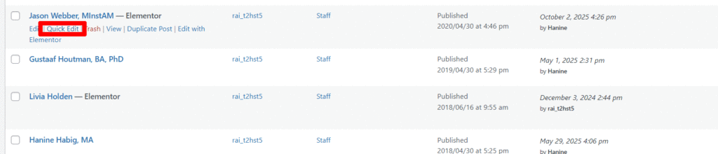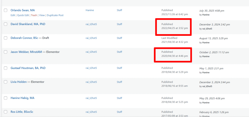 There should be no need to edit the staff page itself but to change the order go to WP dashboard > posts > filter by category “staff”. Here you will see the dates we have set to achieve the desired order.