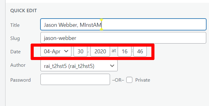 To set the order in which a person appears, set the date by hovering over the post and clicking “quick edit”.
